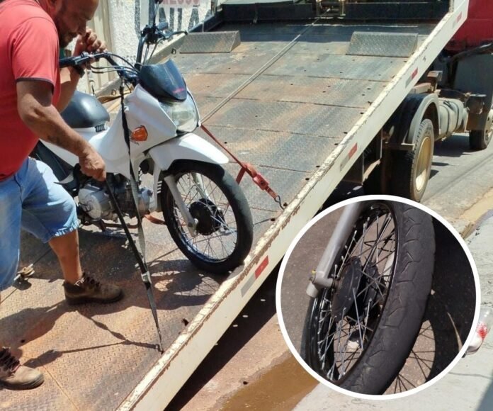 Ao verificarem as condições da moto, foi constatado que os pneus estavam carecas. O veículo foi apreendido e removido ao pátio do Detran da cidade e será liberado após sanar as irregularidades. Ele foi advertido sobre a conduta que tomou e em seguida liberado.